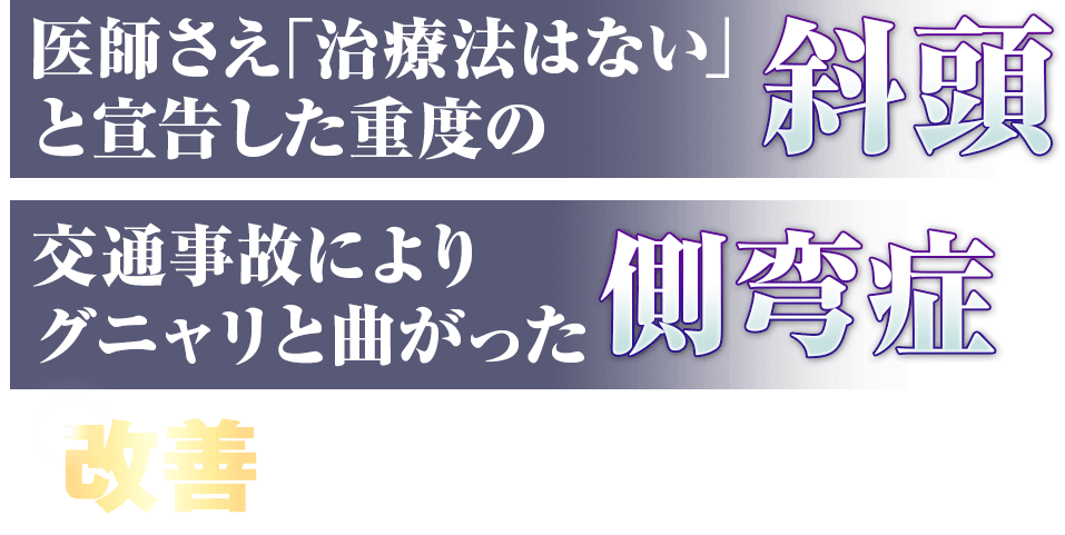 誰が見ても改善が難しいと思う“交通事故による”グニャリと折れ曲がった側弯症患者さんや、医師ですら「治療法はない」と匙を投げたような0歳児の斜頭なども、数回の施術で改善に導けるように。